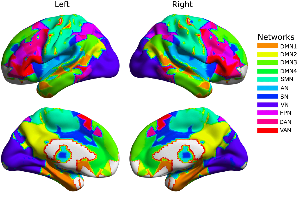 The group-level network partition across two hemispheres detected by the Louvain algorithm resulted in 11 functional networks (Figure 1) corresponding to the sensorimotor network (SMN), auditory network (AN), salience network (SN), visual network (VN), fronto-parietal network (FPN), dorsal attention network (DAN), ventral attention network (VAN), and four sub-networks of the default mode network (DMN), including the medial temporal lobe (MTL) and parts of the superior temporal cortex (DMN1), the posterior cingulate cortex and supramarginal gyrus (DMN2), the medial prefrontal cortex (DMN3), and the inferior parietal lobule, parts of lateral temporal cortex and superior medial prefrontal cortex (DMN4).