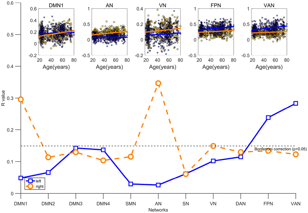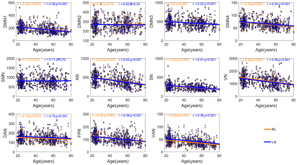 In sum, typical aging will weaken the rsFC in particular functional networks (i.e., attenuation segregation) and enhance the interaction between other functional networks (i.e., increased integration). However, it remains unclear whether intra- and inter-hemispheric segregation and integration occur across the healthy adult lifespan and whether there are distinguishing patterns between two hemispheres. Accordingly, in this cross-sectional study, we aimed to examine age-related differences in the interactions of inter- and intra-hemispheric resting-state functional networks based on the symmetrical cortical template of the human brain.