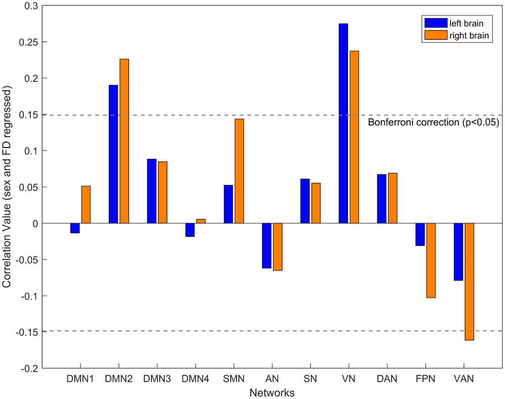 To explore whether distinct patterns of age-related differences in inter-hemispheric segregation exist, we examined the linear relationships between hemispheric segregation of each community and age. As shown in Figure 2, this general pattern depicts that inter-hemispheric segregation increased with aging. Specifically, age was positively associated with inter-hemispheric segregation in the FPN (r = 0.24, P < 0.001) and VAN (r = 0.28, P < 0.001) in the left hemisphere, whereas age was positively associated with inter-hemispheric segregation of brain networks in the right hemisphere mainly located in the DMN1 (r = 0.30, P < 0.001), AN (r = 0.35, P < 0.001), and VN (r = 0.15, P = 0.002). After controlling for sex and mean FD, consistent relationships were found between age and inter-hemispheric segregation in these systems (Supplementary Table 1).