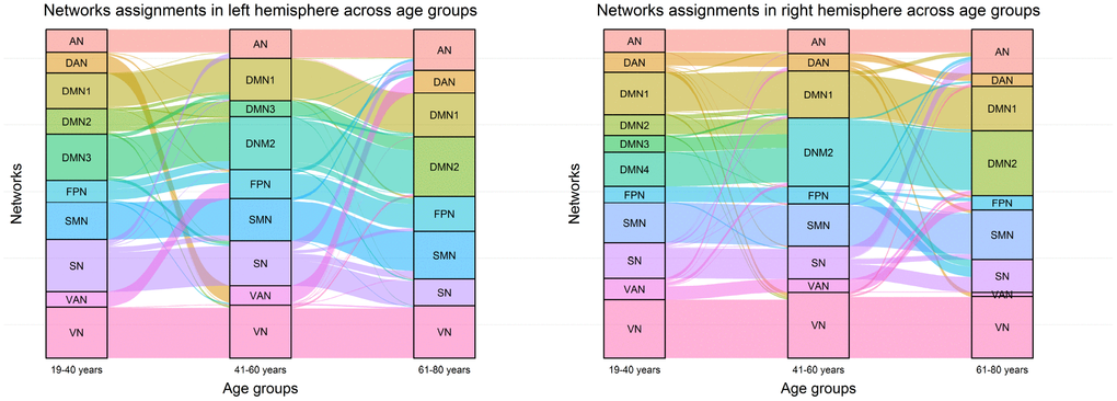 To expand on the observations regarding the dynamics of intra-hemispheric integration with aging, we used an alluvial diagram to illustrate changes in community assignments of brain regions in each hemisphere across three age groups. As shown in Figure 5, the community number decreased with increasing age in both hemispheres. In early adults, the default system consisted of 3 sub-components in the left brain and 4 sub-components in the right brain, while in the elderly group, parts of the default system (e.g., DMN3 and DMN4) merged into the DMN2 and then generated a classical DMN, including the posterior cingulate cortex, supramarginal gyrus, medial prefrontal cortex, inferior parietal lobule, parts of the lateral temporal cortex, and superior medial prefrontal cortex. Notably, the community assignments of the DMN1 (including the medial temporal lobe and parts of the superior temporal cortex) remained stable across the three age groups. For the sensory-motor system, parts of regions within the SN were taken into the AN and SMN, while the VN remained highly stable across age groups. For the executive control system (including the FPN, DAN, and VAN), community assignments of brain regions dynamically changed across age groups only in the bilateral hemisphere, which was merged entirely into the FPN in the late adult.
