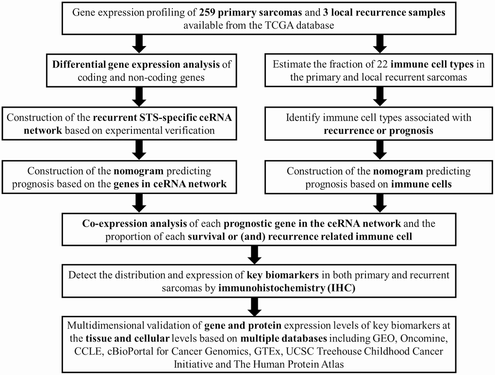In the current study, we identified the differential expressed ceRNAs involved in recurrent STSs based on their gene expression profiling available from the TCGA (The Cancer Genome Atlas) database and used the algorithm “CIBERSORT” to quantify the proportions of immune cells. In addition, prediction nomograms based on recurrence and OS-associated immune cells or ceRNAs were constructed to predict STS recurrence. Moreover, we assessed the relationships between recurrent STS-specific immune cells and ceRNA networks to identify the underlying immune gene signature.
