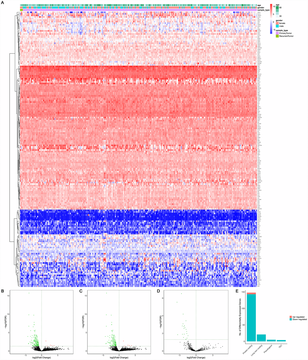 A total of 14,447 lncRNAs, 2,588 miRNAs and 19,660 mRNAs were found from the TCGA database. Among them, 148 differentially expressed protein-coding genes (143 downregulated and 5 upregulated) (Figure 2A–2C, 2E), 21 differentially expressed lncRNAs (downregulated) (Figure 2A, 2D) and 4 differentially expressed miRNAs (downregulated) were identified between primary and recurrent STSs using the cutoff of the log (fold-change) > 1.0 or < −1.0 and FDR < 0.05. Supplementary Table 2 summarizes the top 10 downregulated and top 10 upregulated genes in differential gene analysis.