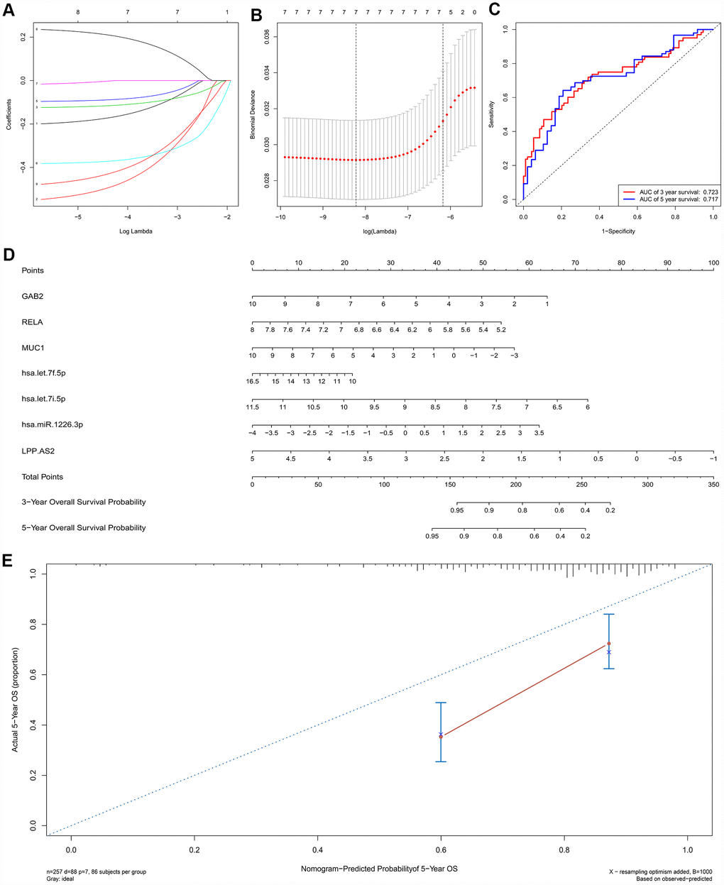 A ceRNA network including 23 genes was established based on the interactions of 11 lncRNA-miRNA pairs and 12 miRNA-mRNA pairs (Figure 3A) (Table 1). The Cox regression and Kaplan-Meier method were applied to examine the relationship between the biomarkers in the recurrence-associated ceRNAs and OS. LPP-AS2 (P = 0.039), MUC1 (P = 0.003), GAB2 (P =0.049), hsa-let-7i-5p (P < 0.001), hsa-let-7f-5p (P = 0.025), hsa-miR-101-3p (P = 0.028) and hsa-miR-1226-3p (P = 0.001) were significantly associated with survival in Kaplan-Meier analysis (Figure 3B–3G). Seven potential recurrence and OS-associated biomarkers were identified as key molecules in the ceRNA network and were integrated into a new multivariable model (Table 2). The results of the Lasso regression indicated that all seven genes were essential for modeling (Figure 4A, 4B). Additionally, the ROC and the calibration curves indicated decent accuracy (Area Under Curve (AUC) of 3-year survival: 0.731; AUC of 5-year survival: 0.724) and good discrimination (Figure 4C, 4E). Then, the nomogram was constructed based on the model (Figure 4D).