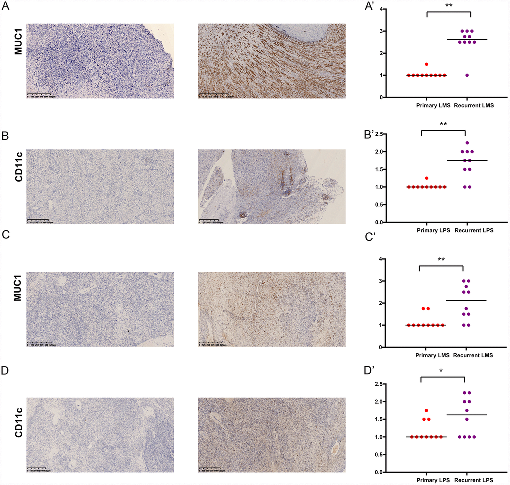 We examined the expressions of MUC1 and CD11c in primary and recurrent leiomyosarcoma (LMS) and liposarcoma (LPS) specimens (Table 4). Of the 10 patients with recurrent LMS, the mean H-score of MUC1 was 2.25, which was significantly higher than that of patients with primary LMS (P < 0.05) (Figure 8A, 8A’). The results of CD11c were similar (Figure 8B, 8B’). Then we compared the H-score of MUC1 and CD11c in patients with primary or recurrent LPS. Both of them were significantly higher in patients with recurrent LPS (Figure 8C, 8C’, 8D, 8D’). In addition, the results showed that the MUC1 and CD11c protein was predominantly localized in the membrane and extracellular matrix of LMS (Supplementary Figure 4A, 4B) and LPS cells (Supplementary Figure 4C, 4D).