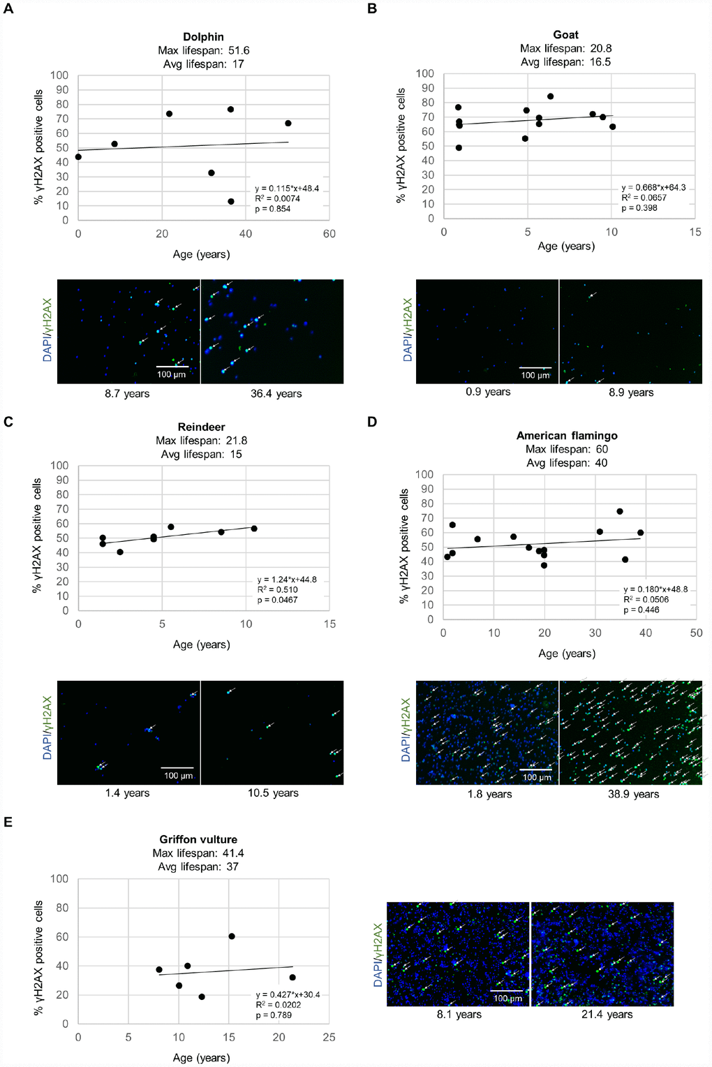 Next, by using these data, we calculated the rate of increase of % of cells with DNA damage with aging. Bottlenose dolphins showed a rate of γH2AX increase of 0.115% positive cells/year (Figure 1A). Goats showed a rate of γH2AX increase of 0.668% positive cells/year (Figure 1B). Reindeer showed a rate of γH2AX increase of 1.24% positive cells/year (Figure 1C). American flamingos showed a rate of γH2AX increase of 0.180% positive cells/year (Figure 1D). Griffon vultures showed a rate of γH2AX increase of 0.427% positive cells/year (Figure 1E). Loggerhead sea turtles showed a very slow rate of γH2AX increase, of 0.137% positive cells/year (Supplementary Figure 1A).