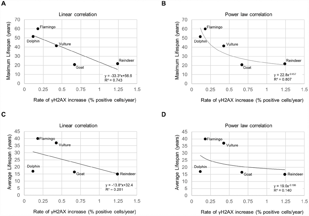 We next investigated the relationship between the rate of increase of % of cells positive for the γH2AX DNA damage marker and species lifespan. For the species maximum lifespan, we used the AnAge database [2]. The average lifespans were obtained from various sources (Supplementary Table 1). We observed a trend for shorter species lifespans with higher rates of accumulation of cells with DNA damage (Figure 2). A graph of the maximum lifespan vs the rate of γH2AX increase resulted in an R2 value of 0.743 with a linear trendline (Figure 2A), and an R2 value of 0.807 with a power law trendline (Figure 2B). A graph of the average lifespan vs the rate of γH2AX increase resulted in lower R2 values with an R2 value of 0.261 with a linear trendline (Figure 2C), and an R2 value of 0.140 with a power law trendline (Figure 2D). These findings show a very good correlation between maximum lifespan and the rate of increase of cells with DNA damage per year both when using a linear and a power law fit to the data.