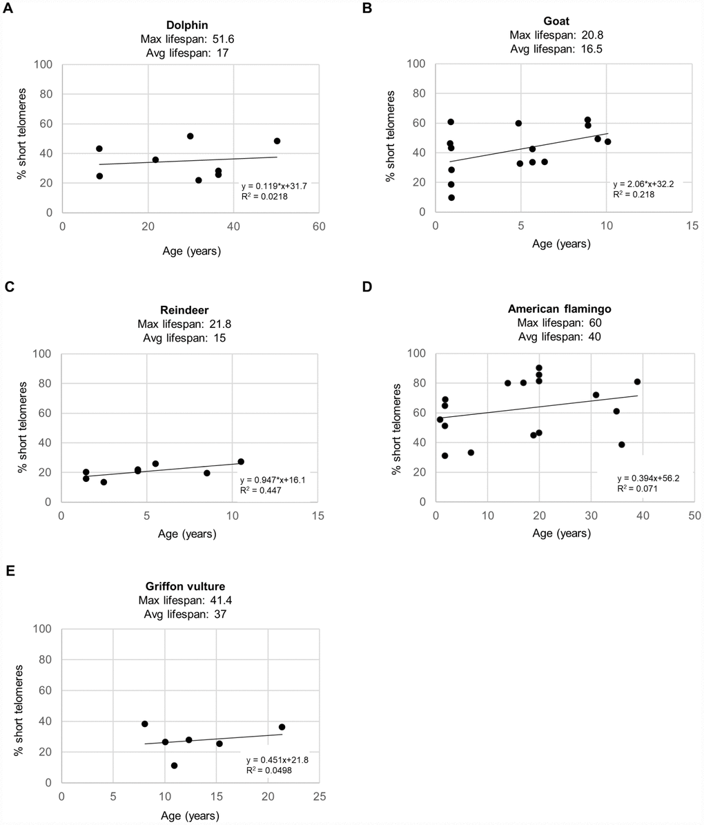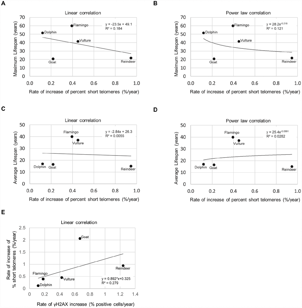 As short dysfunctional telomeres may be contributing to increased DNA damage with aging, we also determined the percentage of cells with very short telomeres by using high-throughput quantitative telomere FISH or HT Q-FISH in dolphins (Figure 3A), goats (Figure 3B), reindeers (Figure 3C), American flamingos (Figure 3D), and griffon vultures (Figure 3E) [24]. The percentage of short telomeres was calculated by a threshold which corresponds to the 25th percentile of the telomere fluorescence intensity values of a young sample for a given species [24, 26]. As expected, all species showed an increase in the percentage of short telomeres with age, concomitant with the fact that telomere length decreased with age as shown in a previous publication [3]. A graph of the maximum lifespan vs the rate of increase of percent short telomeres resulted in an R2 value of 0.184 with a linear trendline (Figure 4A), and an R2 value of 0.121 with a power law trendline (Figure 4B). A graph of the average lifespan vs the rate of increase of percent short telomeres resulted in lower R2 values with an R2 value of 0.0055 with a linear trendline (Figure 4C), and an R2 value of 0.0262 with a power law trendline (Figure 4D). Thus, a modest correlation was obtained between maximum lifespan and the rate of increase of short telomeres. Again, as observed with DNA damage, comparisons with average lifespan were weaker. These findings suggest that short telomeres could be contributing to the increase in DNA damage that we detect associated with aging. In agreement with this, we also found a modest correlation between the rate of increase of short telomeres and the rate of increase of DNA damage with an R2 value of 0.279 (Figure 4E), in agreement with the presence of short telomeres being partially causative of increased DNA damage with age. In support of this, we noticed that the species with the highest rates of γH2AX increase (>0.6 % positive cells/year) were the species with the highest rates of increase in percentage of short telomeres (>0.5 %/year) (Figure 4E).