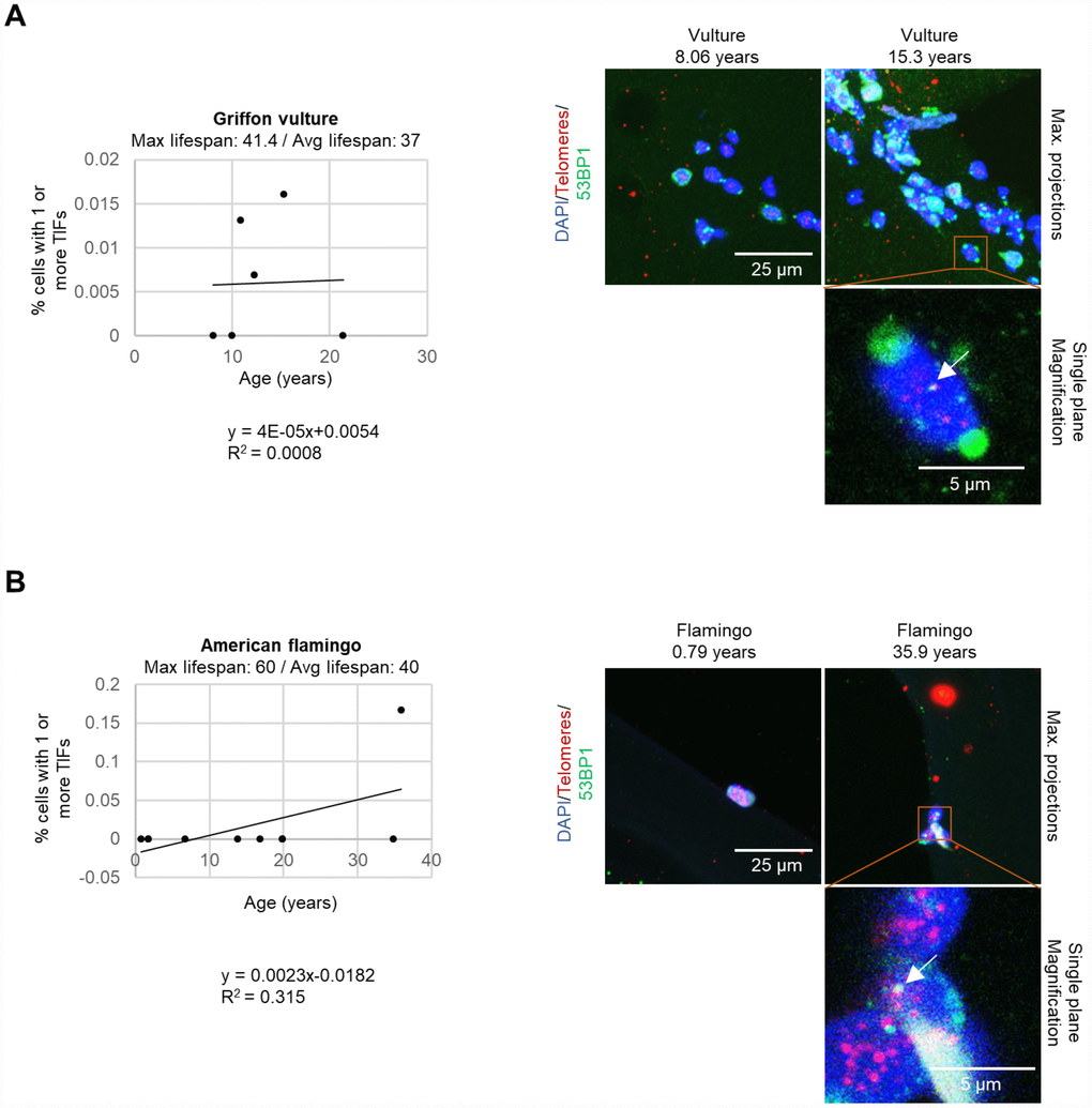We next set to study whether the increase of DNA damage could be located specifically at telomeres, the so-called telomere induced DNA damage foci or TIFs. To this end, we used a small group of species and determined the co-localization of the DNA damage marker 53BP1 with telomeric DNA by performing an immuno-telomere-FISH experiment [26]. A graph of the percent of cells with one or more TIFs (telomere induced foci) is shown for griffon vultures (Figure 5A), American flamingos (Figure 5B), and loggerhead sea turtles (Caretta caretta) (Supplementary Figure 1C). Although very few cells with TIFs were detected, we observed that individuals with increased TIFs (telomere induced foci) were the older individuals. We were only able to obtain samples from 3 individual loggerhead sea turtles, but we observed that only the oldest turtle at an age of 43.7 years old had TIFs (Supplementary Figure 1C), although we did not see increased global DNA damage in the turtle.