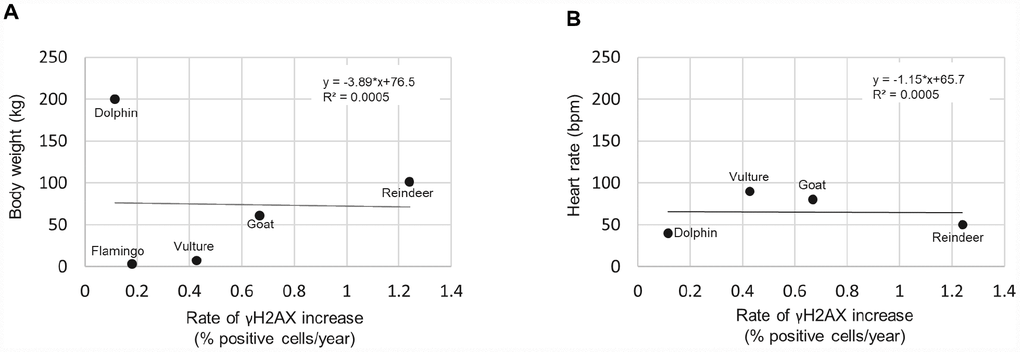 Finally, previous studies have correlated other variables with species lifespan such as body weight [27], and heart rate [28, 29]. However, we did not find any of these variables to correlate with the rate of γH2AX increase (Figure 6), at least with the number of species that were included. A graph of the body weight vs rate of γH2AX increase resulted in an R2 of 0.0005 (Figure 6A). A graph of the heart rate vs the rate of γH2AX increase resulted in an R2 of 0.0005 (Figure 6B). Therefore, with this dataset, we did not detect a strong correlation between the rate of γH2AX increase and body weight or heart rate variables.