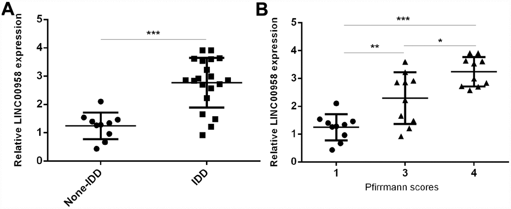 To study the role of lncRNA LINC00958 in IDD development, we first analyzed the expression of LINC00958 in the NP tissues and the scoliotic NP samples. As shown in Figure 1A, a notably upregulated level of LINC00958 was observed in NP samples with IDD compared with the expression levels in scoliotic tissues. Furthermore, we discovered that LINC00958 expression increased gradually along with the grade of exacerbation of disc degeneration (Figure 1B).