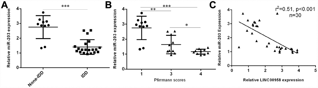 Next, we investigated the expression of miR-203 in the NP tissues and the scoliotic NP samples. As shown in Figure 2A, a notably downregulated level of miR-203 was observed in NP samples with IDD compared with the expression level in scoliotic tissues. Furthermore, we showed that miR-203 expression decreased gradually along with the grade of exacerbation of disc degeneration (Figure 2B). Moreover, we demonstrated that the expression of miR-203 was inversely related with LINC00958 expression in NP samples (Figure 2C).