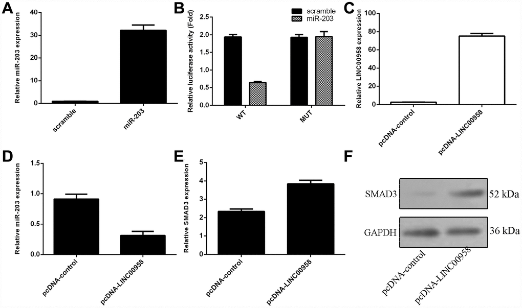 To investigate the mechanism underlying the effect of LINC00958 on NP cell function, bioinformatics analysis was performed to find a potential target gene of LINC00958. Using qRT-PCR, we showed that overexpression of miR-203 enhanced miR-203 expression in the NP cell (Figure 3A). In addition, a dual luciferase reporter analysis indicated that ectopic expression of miR-203 suppressed the luciferase activity of the wild-type LINC00958 3'-UTR but not the mutant LINC00958 3'-UTR (Figure 3B). Moreover, the expression of LINC00958 was significantly upregulated in the NP cell after it was transfected with pcDNA-LINC00958 (Figure 3C). Elevated expression of LINC00958 decreased the expression of miR-203 in the NP cells (Figure 3D). Overexpression of LINC00958 increased the mRNA and protein expression of SMAD3 in the NP cells (Figure 3E and 3F).