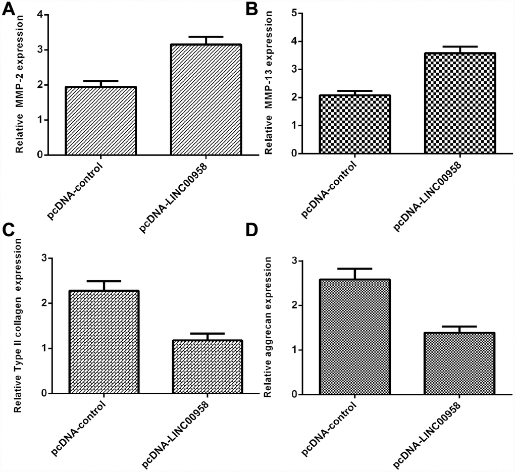 Overexpression of LINC00958 inhibited aggrecan and Col II expression and promoted MMP-2 and MMP-13 expression
