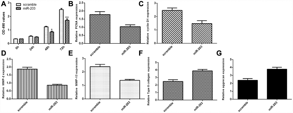 We discovered that elevated expression of miR-203 inhibited NP cell proliferation by using MTT analysis (Figure 6A). Ectopic miR-203 expression inhibited the expression of cyclin D1 in the NP cells (Figure 6B). Elevated expression of miR-203 suppressed PCNA expression in the NP cells (Figure 6C). In addition, we showed that overexpression of miR-203 suppressed the expression of MMP-2 and MMP-13 in the NP cells (Figure 6D and 6E). Moreover, elevated expression of miR-203 induced the expression of Col II and aggrecan in the NP cells (Figure 6F and 6G).