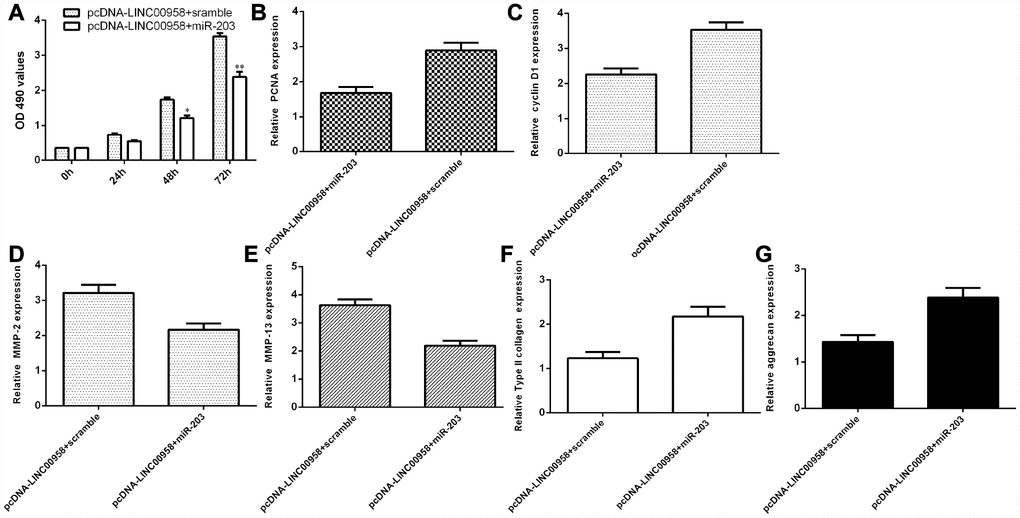 To determine whether the functional effect of LINC00958 in promoting NP proliferation and ECM degradation was due to targeting miR-203, miR-203 was overexpressed in the NP cells through transfection with miR-203 mimic and pcDNA-LINC00958. The MTT analysis indicated that ectopic expression of miR-203 inhibited cell proliferation in the LINC00958-overexpressing NP cells (Figure 7A). In line with this result, the qRT-PCR assay showed that miR-203 overexpression suppressed cyclin D1 (Figure 7B) and PCNA (Figure 7C) expression in the LINC00958-overexpressing NP cells. Furthermore, the qRT-PCR assay demonstrated that elevated expression of LINC00958 suppressed MMP-3 (Figure 7D) and MMP-13 (Figure 7E) expression and enhanced Col II (Figure 7F) and aggrecan (Figure 7G) expression in the LINC00958-overexpressing NP cells.