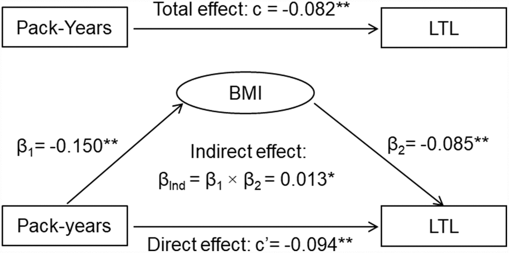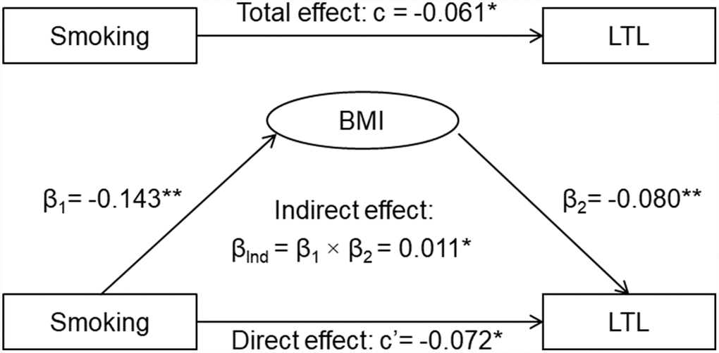 | Total effect: Smoking→LTL ©a | Indirect effect 1: Smoking→BMI (β1) | Indirect effect 2: BMI→LTL (β2) | Direct effect: Smoking→LTL (c’)b | ||||||||||||||||||||||||||||||||||||||||||||||||||||||||||||||||||||||||||||||||||||||||||||||||