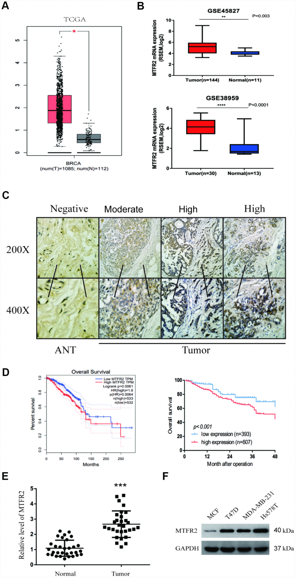 Data on the expression of MTFR2 in BC were obtained from The Cancer Genome Atlas (TCGA, https://gdc.cancer.gov/), which is a public database. The data used in the microarray were based on the Affymetrix platform and were downloaded from the Gene Expression Omnibus (GEO) datasets GSE38959 and GSE45827 (https://www.ncbi.nlm.nih.gov/geo). The data from TCGA were log2 transformed, and the results were analysed using Excel and GraphPad Prism 7.0 software.