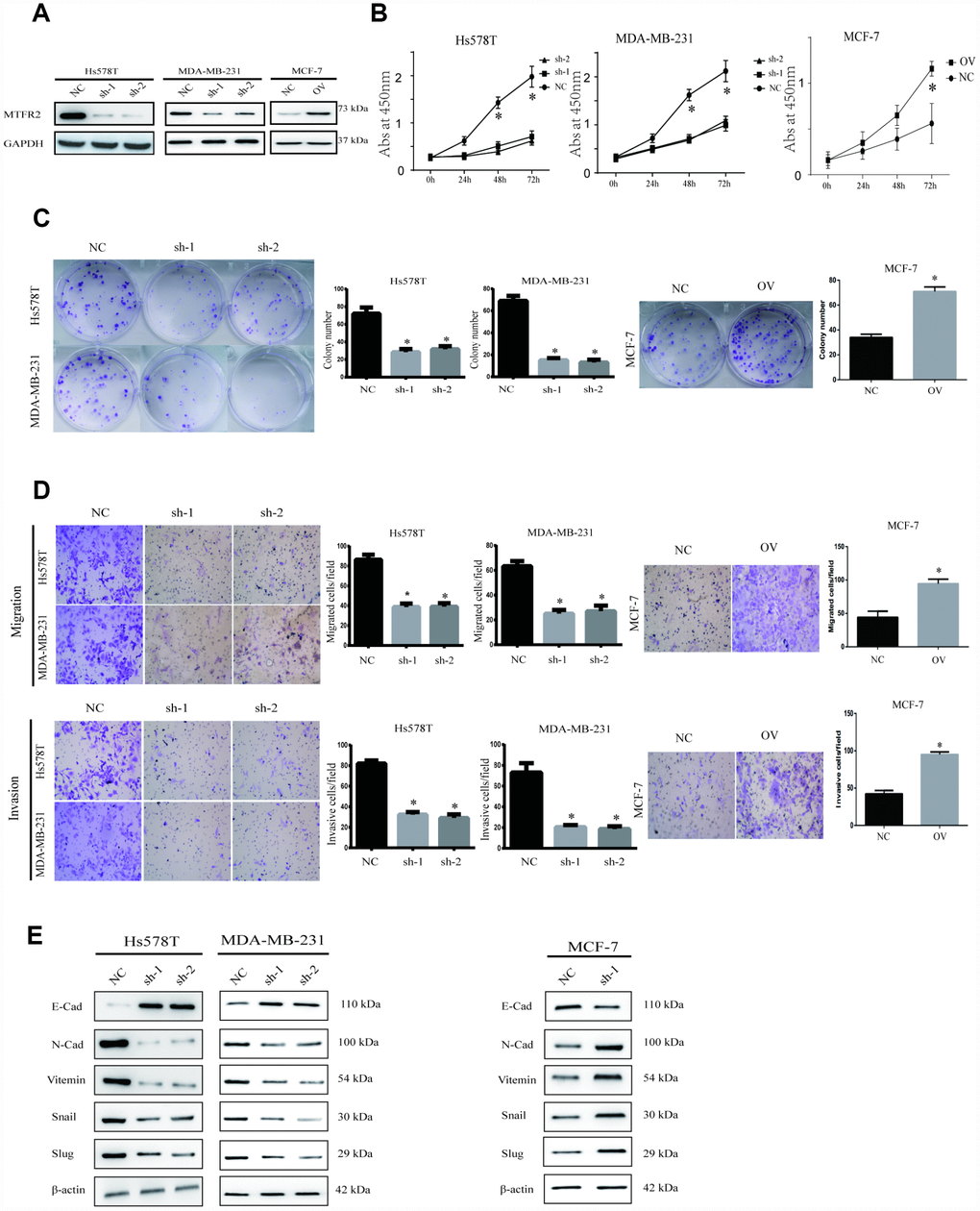 To uncover the bio-function of MTFR2 in BC cells, we analysed MTFR2 expression in BC cell lines. Except for MCF-7, the cell lines expressed high levels of MTFR2 (Figure 1F). MTFR2 was stably knocked down in the Hs578T and MDA-231 cell lines and overexpressed in the MCF-7 cell line (Figure 2A). Colony formation assays and CCK-8 assays revealed that higher levels of MTFR2 showed higher proliferation rates in breast cancer cell lines (Figure 2B, 2C). We next detected the effect of MTFR2 on cell migration and invasion motility. The results revealed that the capability for cell migration and invasion significantly increased in cells with relatively high levels of MTFR2 (Figure 2D). These results suggest that MTFR2 promotes proliferation, migration and invasion in BC cells.