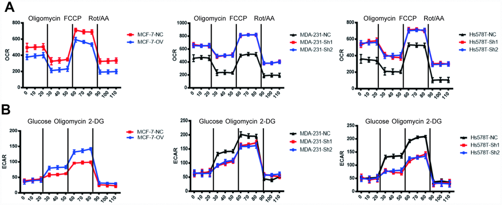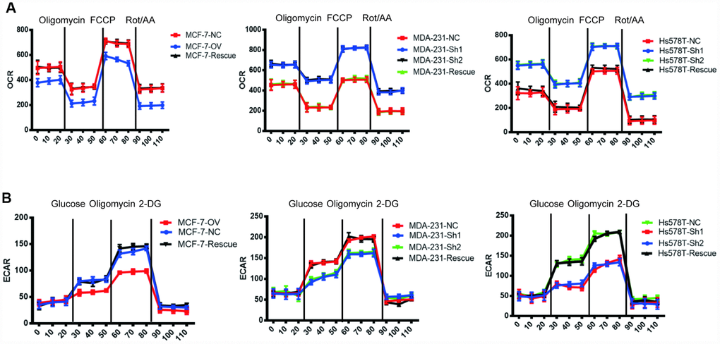 We have previously shown that MTFR2 promotes proliferation, migration and invasion through switching from OXPHOS to aerobic glycolysis. We further studied the OXPHOS function and aerobic glycolysis function in the cell lines described above. The OXPHOS activity markers were totally restored compared with NC in both MDA-231 and Hs578T cell lines (Figure 6A and Figure 6B p<0.001). The reaction of cells to the inhibitors was also totally restored (Figure 6C p<0.001). ATP production decreased in the MCF-7 rescue cell line but increased in the MDA-231 and Hs578T cell lines (Figure 6D p<0.001). The glycolysis markers Glut2, LdhA and LdhB were restored to baseline and lactic acid production, which is an important glycolysis marker restored (Figure 6E and Figure 6F p<0.001). We next applied OCAR and ECAR assays. The results show that the rescue cell line totally returned to baseline compared with the NC cell line (Figure 7A, 7B p<0.001). Taken together, the results show that MTFR2 switches glucose metabolism from OXPHS to aerobic glycolysis in a HIF1 α - and Hif2α-dependent manner, the correlation between MTFR2 and HIF1α and HIF2α in TCGA database was detected in Supplementary Figure 1, however, the correlation didn't quite match, it may due to the complicated network in metabolism, other gene may exert its' function through HIF1α and HIF2α, not only MTFR2.