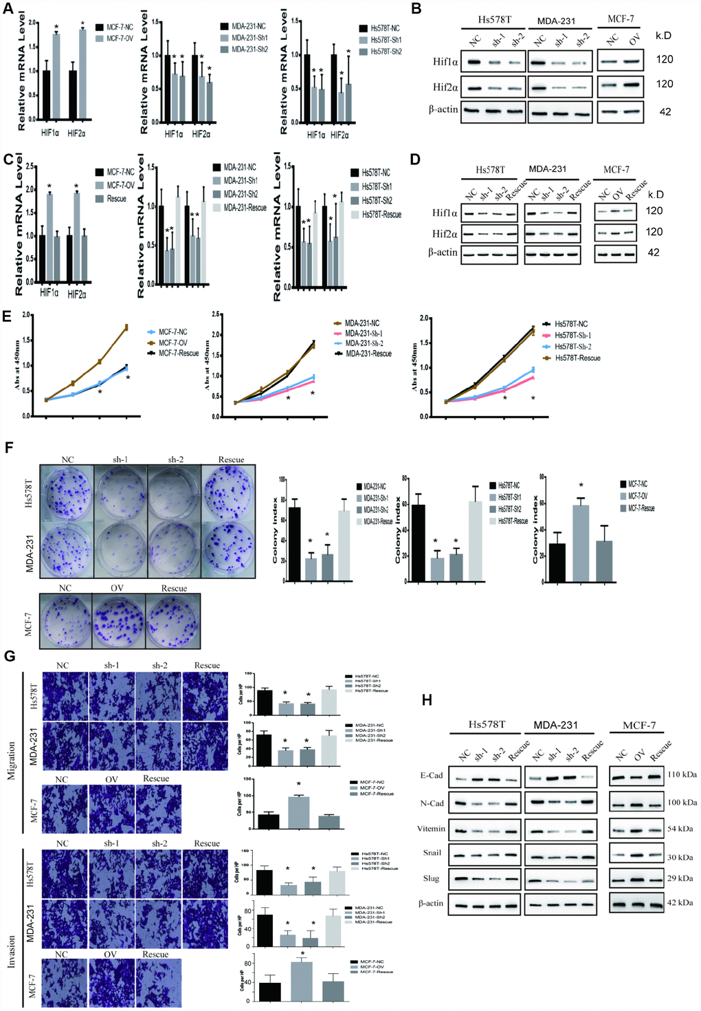 We further investigated the mechanism by which MTFR2 affects OXPHOS and glycolysis. HIF is a key factor in regulating the levels of genes involved in glycolytic respiration. In our study, we found that MTFR2 knockdown resulted in a significant reduction in Hif1α and Hif2α. However, MTFR2 overexpression resulted in significant production of Hif1α and Hif2α (Figure 5A, 5B p<0.001). To further confirm the critical role of HIF1α and Hif2α in mitochondrial functions, we constructed a rescue cell line; we overexpressed both HIF1α and Hif2α in the MTFR2 knockdown cell line and knocked down both HIF1α and Hif2α in the MTFR2-overexpressing cell line (Figure 5C, 5D p<0.001). We next applied proliferation, Transwell, and invasion chamber assays. MTFR2 promoted the proliferation, migration and invasion of BC cells, which corresponded to the previous study, and the function of the rescue cells was totally restored compared with the NC cells (Figure 5E–5G p<0.001); the EMT markers were also totally restored (Figure 5H p<0.001), indicating that MTFR2 exerts its function in a HIF1α- and Hif2α-dependent manner.