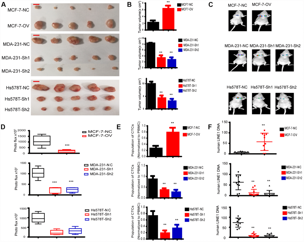 We have indicated that MTFR promotes the proliferation and migration and invasion of breast cancer in vitro. To further uncover the biological function, we established a xenograft mouse tumour model and a lung metastasis model. As shown in Figure 8A, 8B, the tumour volume of MCF-7-OV significantly increased compared with the control, whereas knockdown of MTFR in MDA-231 and Hs578T cells inhibited tumour growth. Lung metastasis significantly increased in cells with higher levels of MTFR (Figure 8C, 8D p<0.001). Metastasis is a complicated process that includes early invasion and late colocation into target organs. We analysed the circulating tumour cells (CTCs) from whole blood samples. The results were normalized to peripheral blood mononuclear cells (PBMCs). The results show that the population of CTCs increased in MCF-7-OV, MDA-231-NC and Hs578T-NC cells (Figure 8E p<0.01). We also analysed the human LINE1 DNA level, another indicator of CTCs, normalized to mouse LINE1 DNA levels. Cells with relatively high levels of MTFR harbour relatively high levels of human LINE1 DNA (Figure 8F p<0.01).