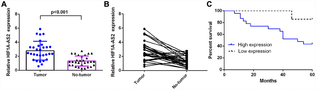 Long noncoding RNAs (lncRNAs) are a group of transcripts that lack protein-coding potential and that are longer than 200 nucleotides [15–18]. Increasing studies have implicated dysregulated lncRNAs in multiple tumors, such as hepatocellular carcinoma, lung cancer, colorectal cancer, bladder cancer and osteosarcoma [19–25]. LncRNAs play vital roles in tumor apoptosis, proliferation, differentiation, metastasis and invasion [26–30]. Recently, a new lncRNA, HIF1A-AS2, was found to be dysregulated in several tumors, such as colorectal cancer, breast cancer, glioblastoma, bladder cancer and gastric cancer [31–35]. It was found that HIF1A-AS2 promoted cell proliferation and invasion. However, the expression and potential role of HIF1A-AS2 in the development of osteosarcoma remain unknown.