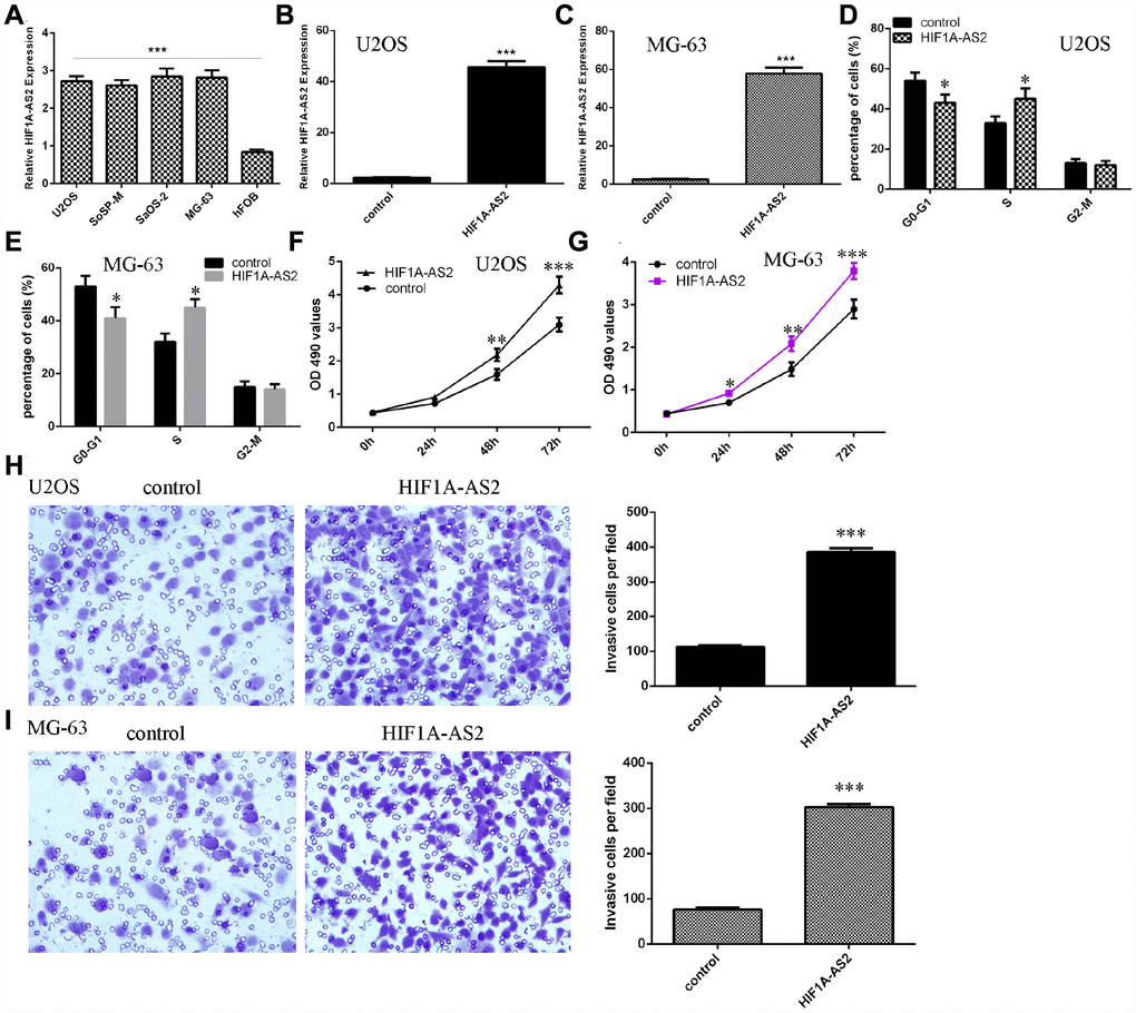 Next, we showed that the expression of HIF1A-AS2 was upregulated in osteosarcoma cell lines (U2OS, SoSP-M, SaOS-2, MG-63) compared to the expression in the osteoblast cell line (hFOB) (Figure 2A, p<0.001). Then, we confirmed that pcDNA-HIF1A-AS2 could enhance the expression of HIF1A-AS2 in U2OS (Figure 2B, p<0.001) and MG-63 (Figure 2C, p<0.001) cells by using qRT-PCR analysis. Moreover, ectopic expression of HIF1A-AS2 increased the S phase of the U2OS (Figure 2D, p<0.05) and MG-63 (Figure 2E, p<0.05) cells compared to that of the control group. The MTT analysis was conducted to measure the growth of the U2OS and MG-63 cells after ectopic expression of HIF1A-AS2. Overexpression of HIF1A-AS2 promoted U2OS (Figure 2F) and MG-63 (Figure 2G) cell growth. Ectopic expression of HIF1A-AS2 increased U2OS (Figure 2H, p<0.001) and MG-63 (Figure 2I, p<0.001) cell invasion, and the relative invasive cells are shown.