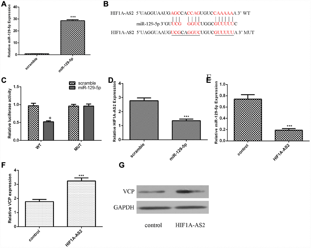 Using qRT-PCR analysis, we confirmed that the miR-129-5p mimic could enhance the expression of miR-129-5p in MG-63 cells (Figure 3A, p<0.001). The binding sites between HIF1A-AS2 and miR-129-5p were identified by using bioinformatics analysis (Figure 3B). A luciferase reporter assay was conducted to validate the binding site combinations. We showed that overexpression of miR-129-5p could decrease the luciferase activity of wild-type (WT) HIF1A-AS2 but not that of the mutant HIF1A-AS2 (Figure 3C, p<0.05). Overexpression of miR-129-5p decreased the expression of HIF1A-AS2 in MG-63 cells (Figure 3D, p<0.01). Ectopic expression of HIF1A-AS2 suppressed miR-129-5p expression in MG-63 cells (Figure 3E, p<0.01). Furthermore, we showed that overexpression of HIF1A-AS2 increased VCP expression in MG-63 cells (Figure 3F, p<0.01). We also confirmed that ectopic expression of HIF1A-AS2 promoted VCP protein expression in MG-63 cells (Figure 3G).