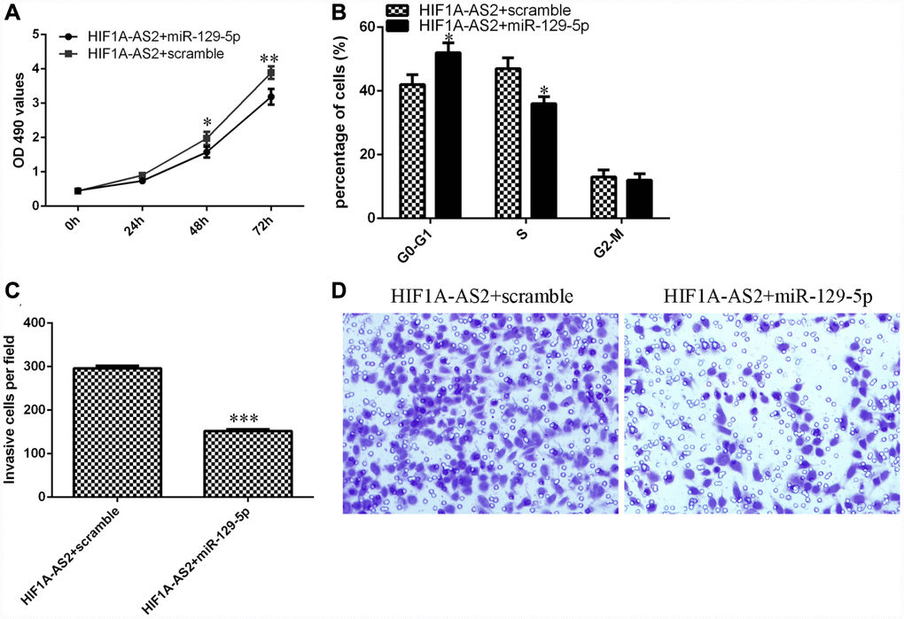 We aimed to determine whether HIF1A-AS2 acted by silencing miR-129-5p expression. The MTT assay indicated that the miR-129-5p mimic could inhibit the promotion of proliferation induced by HIF1A-AS2 overexpression (Figure 6A). Ectopic expression of miR-129-5p decreased the S phase of the HIF1A-AS2-overexpressing MG-63 cells compared to that of the scrambled group (Figure 6B, p<0.05). In addition, elevated expression of miR-129-5p suppressed the invasion of HIF1A-AS2-overexpressing MG-63 cells compared to that of the scramble group (Figure 6C and 6D, p<0.001).