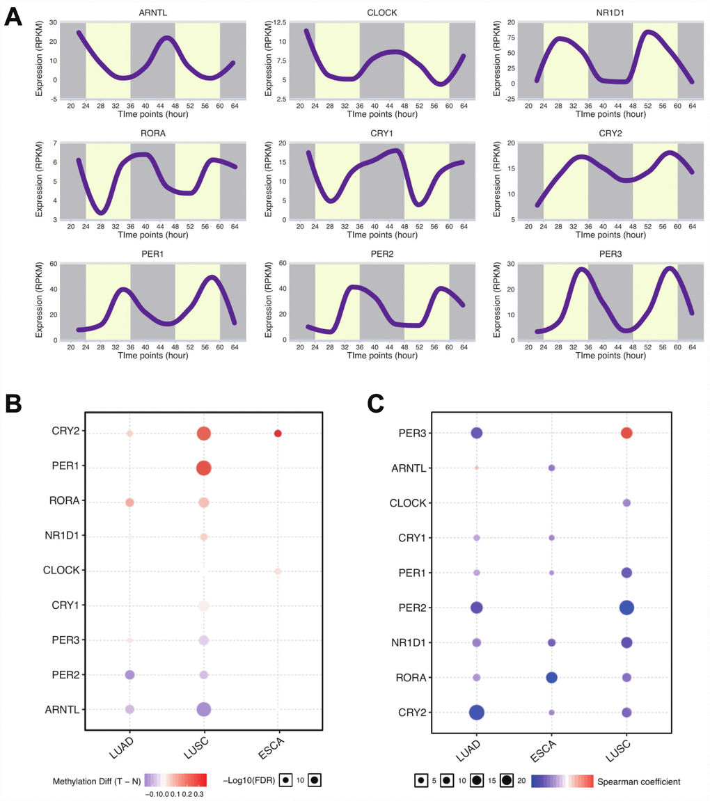 To explore the role of circadian clock in tumors, we first selected the core circadian clock genes, including CLOCK, BMAL1, CRY1, CRY2, NR1D1, PER1, PER2, PER3, and RORA based on the literature [14, 15], to characterize the circadian state of patients. In the normal tissue dataset (GTEX), PER1, NR1D1, and CRY2 were highly expressed in esophagus and lung tissues (Supplementary Figure 1). Next, we computed the expression profile of those core circadian genes of lung tissue at different timings by using RNA-seq [16] and observed the oscillation of those genes (Figure 1). We next retrieved data of lung adenocarcinoma (LUAD) patients, lung squamous cell carcinoma (LUSC) patients, and esophageal carcinoma (ESCA) patients from The Cancer Genome Atlas (https://cancergenome.nih.gov). We computed the methylation level between normal tissues and tumors. As for LUAD and LUSC, over a half of core circadian clock genes was differently methylated between tumors and controls (Figure 1). However, in ESCA, only CLOCK and CRY2 methylation levels were significantly different. We also found that methylation downregulated almost all the circadian clock gene expressions in thoracic cancers (Figure 1). These data supports that core circadian clock genes are epigenetically altered in thoracic cancers.