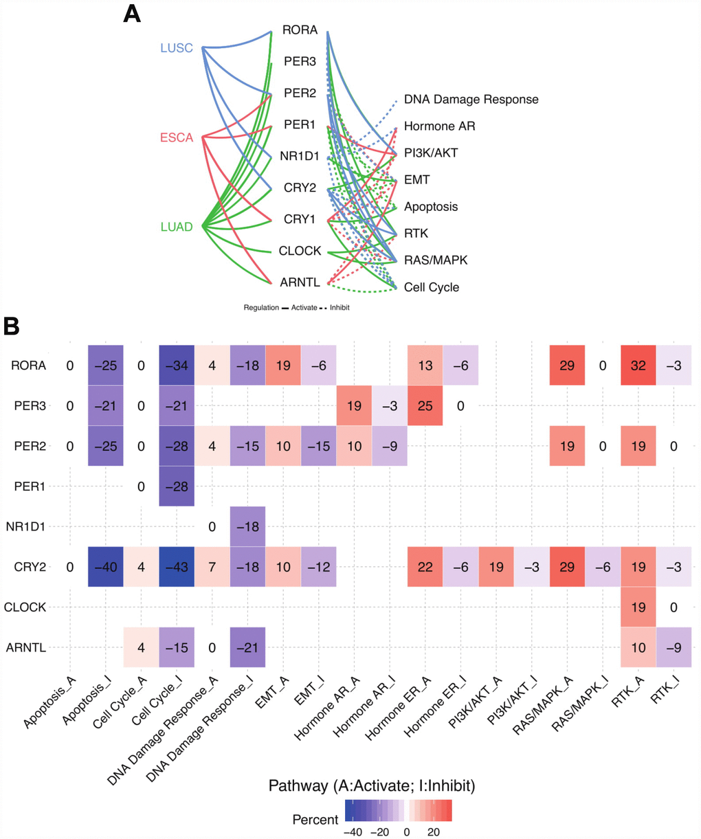 In order to evaluate the potential effects of disruption of circadian clock in thoracic cancer patients, we attempted to compute the activities of hallmark pathways including TSC/mTOR, RTK, RAS/MAPK, PI3K/AKT, Hormone ER, Hormone AR, EMT, DNA Damage Response, Cell Cycle, and Apoptosis pathways. We extracted data from The Cancer Proteome Atlas (http://tcpaportal.org/tcpa/) to compute activity scores for 10 cancer related pathways and 3 cancer types. RPPA data were normalized by standard deviation, and pathway score equals to the relative protein level of all positive-regulatory molecules minus negative-regulatory molecules (see Methods).