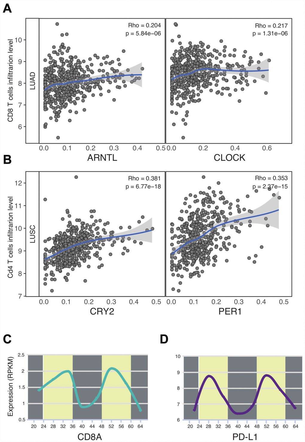 The immune checkpoint inhibitor has profoundly changed the landscape of thoracic cancer treatments. A recent paper shed light on the circadian rhythm of immune checkpoints in sepsis [13]. Yet, in the context of cancer, the impact of circadian clock on immune checkpoints and immunotherapy still remains unclear. In order to characterize the tumor microenvironment features in thoracic cancers, we first computed the infiltration level of CD8 T cells as is described before [20]. Unexpectedly, our results highlight the biological role of circadian clock on immune functions in LUAD and LUSC. Especially in LUAD patients, two essential daytime circadian clock genes were all correlated with the infiltration level of CD8 T cells, which are the crucial target of immune checkpoint inhibitors. As for LUSC patients, CRY2 and PER1 were observed to correlate with CD4 T cells. In order to confirm our results, we computed the circadian rhythm of CD8 T cells (CD8A) in lung tissues (P = 3.73e-03) [16]. We also sought to calculate other immune cell markers, however, we cannot retrieve the available data. Next, we identified the circadian rhythm of immune checkpoint PD-L1 (Figure 4D). Surprisingly, in normal lung tissues, the PD-L1 expression was time-dependent (P = 2.33e-03). These data supports the possible association between the circadian clock and immune infiltrates in thoracic cancers.