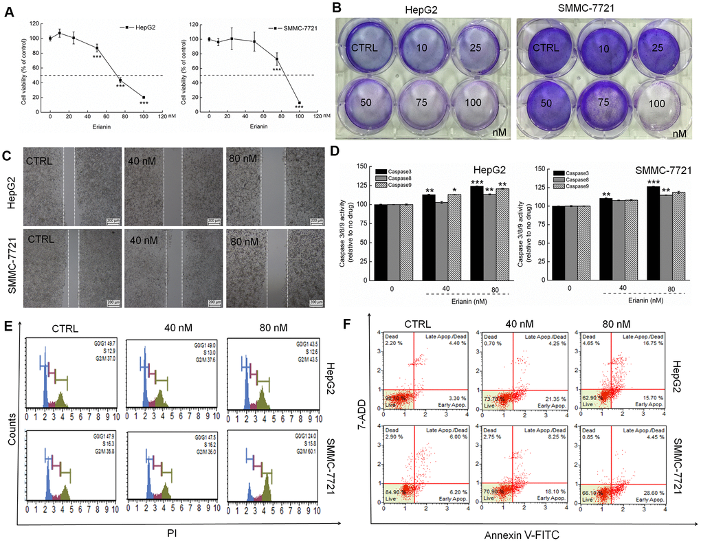 The IC50 values of erianin on HepG2 and SMMC-7721 cells for a 24-h exposure were 43.69 nM and 81.02 nM, respectively (P < 0.001, Figure 1A). Erianin significantly inhibited the formation of HepG2 and SMMC-7721 cell colonies (P < 0.05, Figure 1B and Supplementary Figure 1A). In the cell scratch test, the migration ability of liver cancer cells was significantly inhibited after 24 h of co-culture with erianin (P < 0.05, Figure 1C and Supplementary Figure 1B). After a 24-h exposure to erianin, the activities of caspase-3, -8, and -9 (serving as apoptosis markers) were strongly enhanced (P < 0.001, Figure 1D). Compared with non-treated cells, erianin at 80 nM caused significant G2/M phase arrest in HepG2 and SMMC-7721 cells (Figure 1E). Erianin, especially at 80 nM, caused 32.45% and 33.05% of early/late apoptosis in HepG2 and SMMC-7721 cells, respectively (Figure 1F).