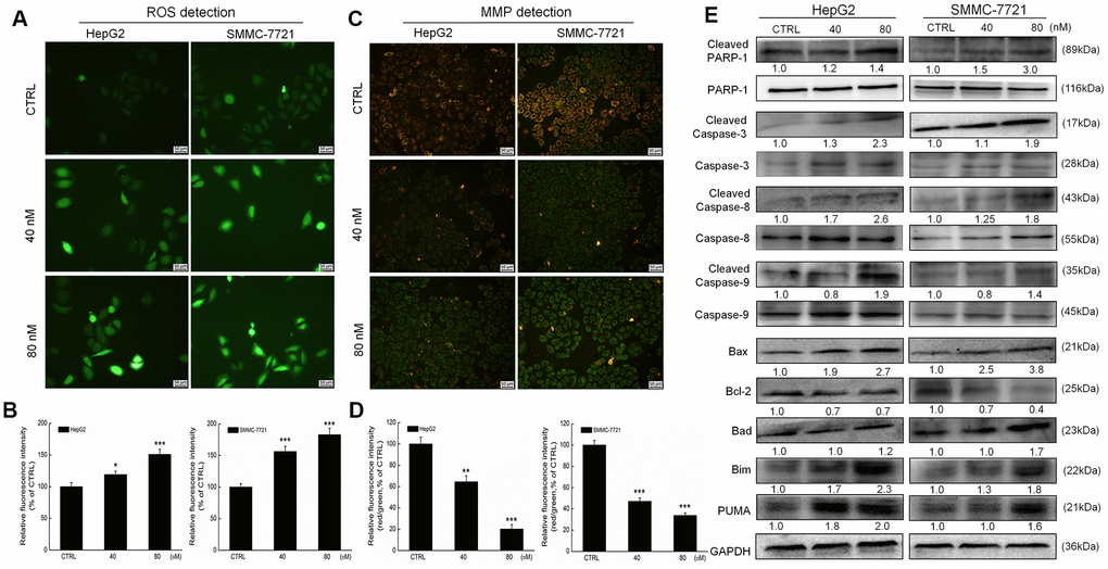 HepG2 and SMMC-7721 cells were plated into 6-well plates at 2×105 cells/well and incubated with erianin at 40 and 80 nM for 6 h. Treated cells were either incubated with fluorescent probe 2,7-dichlorofluorescein diacetate (DCFH-DA; Sigma-Aldrich, USA) (final concentration 10 μM) for 20 min at 37°C in darkness to analyze the intracellular levels of ROS, or stained with 5,5′,6,6′-Tetrachloro-1,1′,3,3′-tetraethylbenzimidazolylcarbocyanine iodide (JC-1; Sigma-Aldrich, USA) (final concentration 2 μM) for 15 min at 37°C in darkness to analyze the MMP changes. After washing, the fluorescence intensity was measured using an Eclipse TE 2000-S fluorescence microscope (Nikon Corp., Tokyo, Japan). The quantitative data were analyzed with the ImageJ software version 1.46.