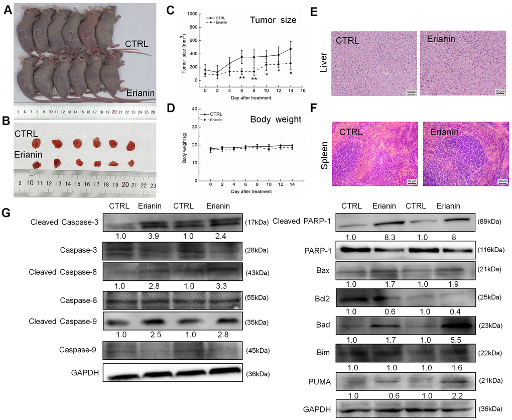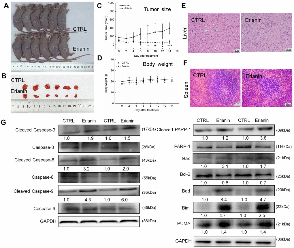 Compared with non-treated nude mice, 14-day erianin treatment resulted in significant increments in the ratio of cleaved PARP/PARP, cleaved caspase-3, -8, and -9/caspase-3, -8 and -9, and the expression levels of Bax, Bad, Bim and PUMA, and reduction in the expression levels of Bcl-2 in HepG2-xenografted tumors (Figure 3G) and SMMC-7721-xenografted tumors (Figure 4G).
