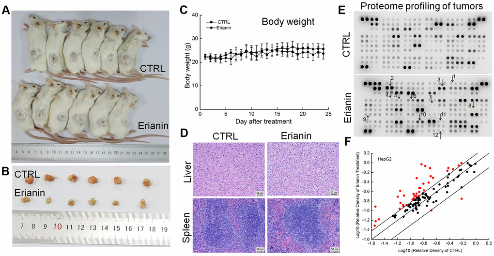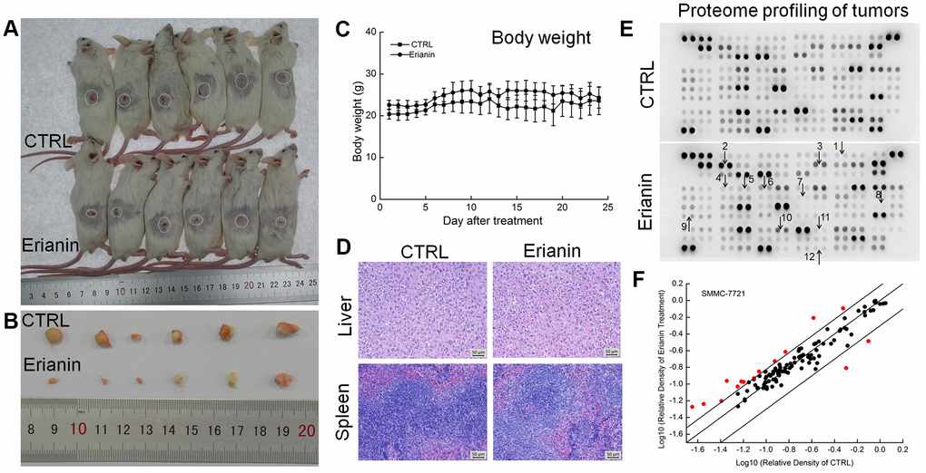 The tumor-xenografted BALB/c mice were used to further investigate the inhibitory effects of erianin on tumor growth. A 24-day erianin treatment at 20 mg/kg strongly inhibited the growth of HepG2-xenografted tumors (Figure 5A, 5B) and SMMC-7721-xenografted tumors (Figure 6A, 6B) without influencing the animals’ body weight (Figures 5C, 6C). According to H&E staining, in both CTRL and erianin-treated mice, the cells in liver and spleen were uniform in structure, and no inflammatory infiltration were noted in the organs (Figures 5D, 6D).