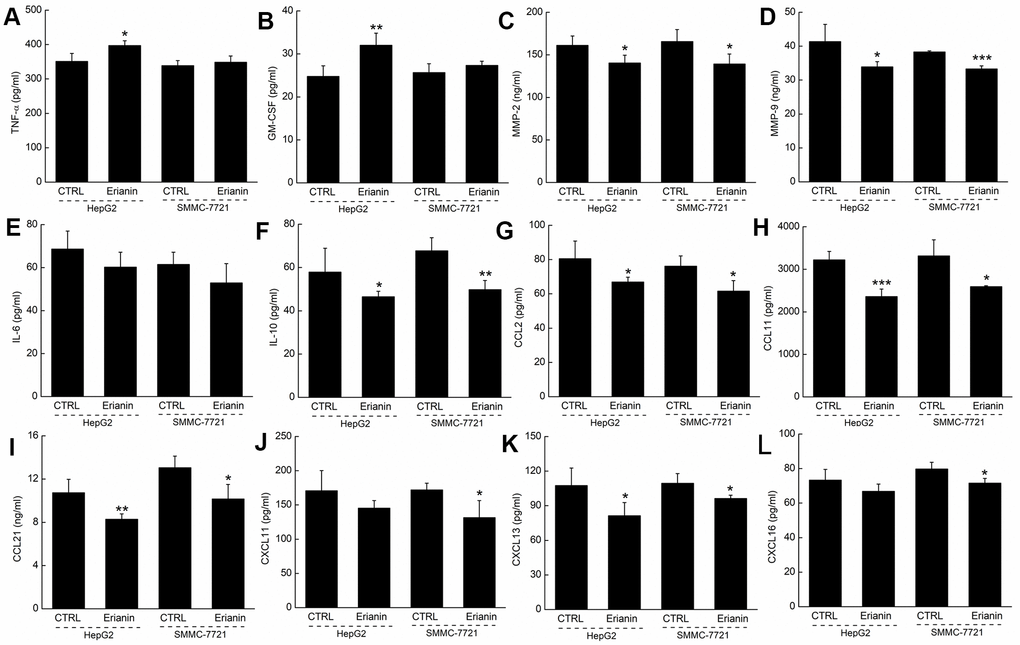 Based on the results obtained from proteome profiling, 12 types of immunological correlation factors in the serum of BALB/c were analyzed via enzyme-linked immunosorbent assay (ELISA). In the mice bearing HepG2- and SMMC-7721-xenografted tumors, erianin enhanced the serum levels of tumor necrosis factor-α (TNF-α, contributing to immune response and cell apoptosis) (P < 0.05) (Figure 7A) and granulocyte-macrophage colony stimulating factor (GM-CSF, enhancing the activation of T cells and the killing function of T cells on tumor cells) (P < 0.01) (Figure 7B), and reduced the serum levels of matrix metalloproteinase 2 (MMP-2, promoting the invasion, metastasis, and angiogenesis of tumors [28]) (P < 0.05) (Figure 7C), matrix metalloproteinase 9 (MMP-9, serving as a biomarker for cancer detection [29]) (P < 0.05) (Figure 7D), IL-10 (known as an inhibitor of inflammation) (P < 0.05) (Figure 7F), CCL2 (MCP-1, product by macrophages and indirectly promoting the invasion and metastasis of tumors [30]) (P < 0.05) (Figure 7G), CCL11 (promoting blood vessel growth of tumors [31]) (P < 0.05) (Figure 7H), CCL21 (mediating the metastasis of tumor cells to lymph nodes [32]) (P < 0.05) (Figure 7I), CXCL11 (promoting tumor progression [33]) (P < 0.05) (Figure 7J), CXCL13 (responsible for the imbalances in microenvironments of B cells [34]) (P < 0.05) (Figure 7K) and CXCL16 (markers of cancer cell production in inflammatory environment [35]) (P < 0.05) (Figure 7L).