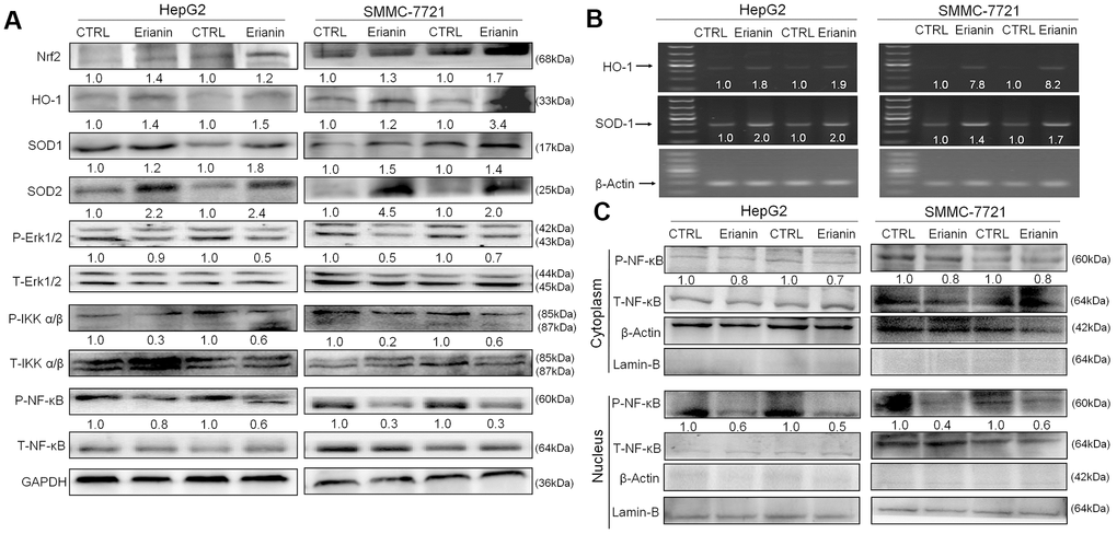 HepG2 and SMMC-7721 cells were plated into 6-well plates at 2×105 cells/well and incubated with erianin at 40 and 80 nM for 24 h. Treated cells, tumor tissues obtained from BALB/c nude mice, and spleen tissues obtained from BALB/c mice were homogenized by radioimmunoprecipitation assay buffer containing 1% protease inhibitor cocktail and 2% PMSF (Sigma-Aldrich, St. Louis, MO, USA). The cytoplasm and nuclear protein in the spleens of BALB/c mice bearing with HepG2- and SMMC-7721-xenografted tumors were isolated using NE-PER Nuclear and Cytoplasmic Extraction Kit (Thermo Fisher Scientific, Waltham, MA, USA). The protein concentration of samples was analyzed by a Standard BCA Protein Assay Kit (Merck Millipore, Billerica, MA, USA) following the manufacturer's instructions. Forty-microgram samples were electrophoresed and separated with 10% SDS-PAGE gel at 90 V-120V, and then transferred onto PVDF membranes (0.45 μm, Merck Millipore, Billerica, MA, USA) at 100 V for 2 h. Membranes were blocked with 5% BSA (Genview, USA) in TBS and then incubated overnight at 4 °C with primary antibodies poly (ADP-ribose) polymerase (PARP-1, sc8007), cleaved PARP-1 (sc56196) (Santa Cruz, USA), superoxide dismutase-1 (SOD-1, bs-10216R), total (T)-caspase-3 (bs-0081R), Bim (bs-1488R), PUMA (bs-1573R), Lamin-B (bs-1840R) (Bioss Antibodies, China), cleaved caspase-3 (ab2302), T-caspase-8 (ab181580), T-caspase-9 (ab25758), Bad (ab32445), Bax (ab32503), B-cell lymphoma-2 (Bcl-2) (bsm-33047M), Nrf2 (ab89443), HO-1 (ab137749), SOD-2 (ab13533), T-NF-κB (ab7970), phosphor (P)-NF-κB (ab86299), T-Erk1/2 (ab36991), P-Erk1/2 (ab76299), T-IKKα/β (ab178870), P-IKKα/β (ab195907), β-actin (ab179467) and GAPDH (ab8245) (Abcam, Cambridge, MA, USA), cleaved caspase-9 (9505s), cleaved caspase-8 (8592s) (Cell Signaling, Danvers, MA, USA). After washing, the membranes were incubated with the secondary antibody at room temperature for 2 h and then detected with electrochemiluminescence detection kits (Merck Millipore, Billerica, MA, USA) for visualization. Protein bands were detected using ImageJ software (NIH, Bethesda, MD, USA).