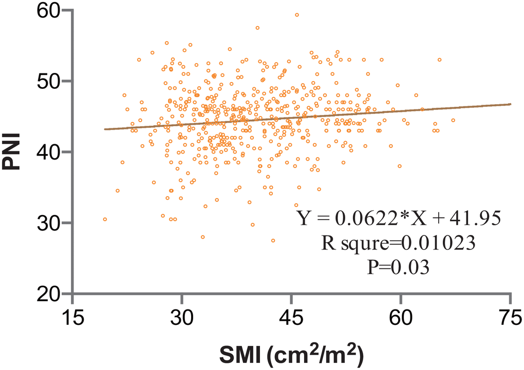 Median follow-up duration was 24 months, ranging from 3 months to 77 months. Median BMI was 24.1 kg/m2 (ranging from 14.9 to 36.8 kg/m2), including males of 26.0 kg/m2 and females of 21.7 kg/m2 (P-value<0.001), while median SMI value of males has no statistical difference compared to females (40.5 cm2/m2 versus 39.0 cm2/m2, P-value=0.064). Linear regression relationship between SMI and PNI was determined in Figure 1 (P<0.05) and the R square for relation was 0.01.
