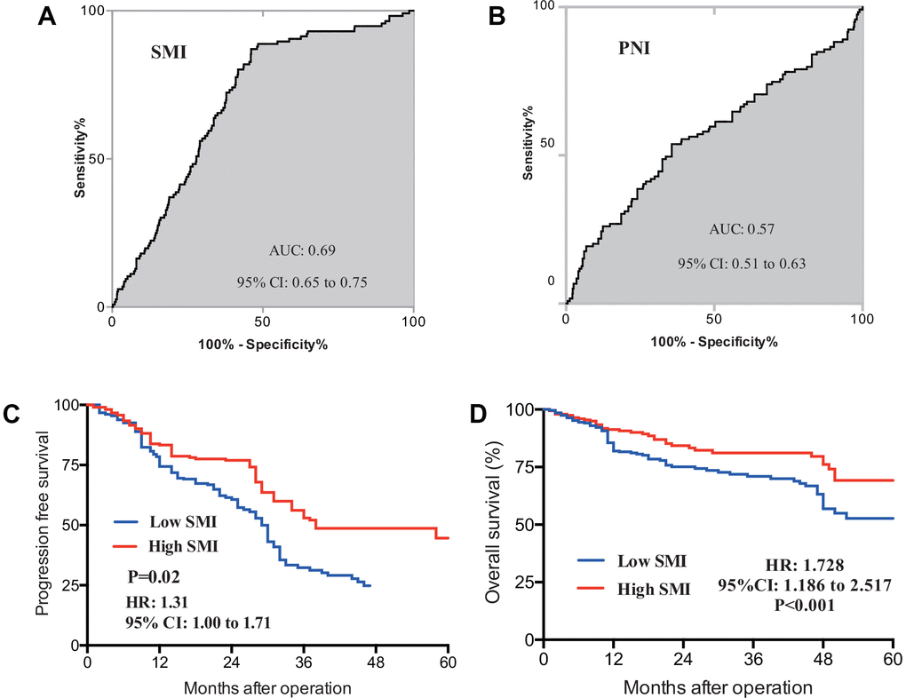 When cut-off values for SMI were applied (43 cm2/m2 for males and 41 cm2/m2 for females), the cohort was divided into 309 (57.3%) and 230 (42.7%) patients with low and high SMI. Baseline low SMI was observed in 116 of 184 females (63.0%) and 193 of 355 males (54.4%) (P=0.05). Comparisons of clinical features of CRLM patients with low or high-SMI were shown in Table 2. Patients with low SMI had significantly smaller pre-albumin (P-value=0.01), smaller PNI (P-value=0.04) and shorter hospital stays (P-value=0.03) compared with those with high SMI. There was no difference in the value of transferrin, CRP, lymphocyte count, CEA and CA19-9. To identify the prognostic role of baseline SMI, ROC curves and Kaplan-meier analysis were performed. As is shown in Figure 2, time-dependent ROC curves were separately constructed to compare clinical value of baseline SMI and PNI. Area under curve (AUC) of baseline SMI and PNI were 0.69, 0.57 in Figure 2A and 2B, respectively. CRLM patients with low SMI was demonstrated to have shorter duration of PFS (Figure 2C, P-value=0.02, HR: 1.31; 95%CI: 1.00-1.71) and OS (Figure 2D, P-value<0.001, HR:1.728; 95%CI: 1.186-2.517) than their high SMI counterparts.