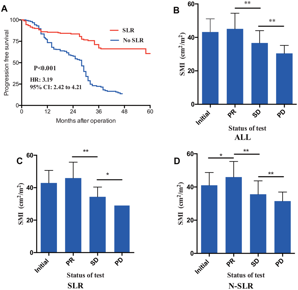 Tumor recurrence and metastasis were recognized as the most essential factors for survival. Here, we provide additional evidence that SMI was predictive for tumor progression. Comparing PFS from baseline high SMI cohort to Low SMI cohort, the median duration of PFS significantly decreased from 38 months to 29 months (P=0.002). Furthermore, patients in status of PD also had lower SMI compared with other status of the CT test, which demonstrating that SMI can consistently reflect the treatment response to some extent. Moreover, it must be noted that N-SLR subgroup analysis showed a higher SMI in PR status (P-value<0.001).