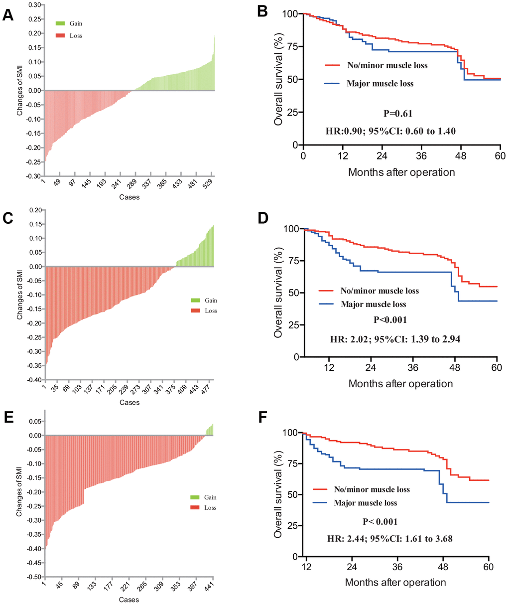 To explore the indicative clinical value of SMI changes in CRLM patients, further analysis was performed. Table 4 confers all changes of SMI and SMD in each period after the operation. Compared with the significant changes in muscle area (MA), our analysis showed that muscle density was not statistically changed after operation. For the change of MA, at the first postoperative evaluation of SMI based on CT scan (3 months after operation), median change of MA was -3.7% (Figure 4A) (skeletal muscle mass decreased by 3.7 percent), ranging from -25.6% to 19.4% (skeletal muscle mass increased by 19.4 percent). On the following 6 and 12 months postoperative CT scan, median change of MA was separately -8.8% (95% CI: -11.7% to -2.3%) and -10.1% (95% CI: -15.2% to -6.5%) (Figure 4C and 4E). It is reported that 8% decreased SMI was regarded as the cut-off value of major SMI loss [33]. Figure 4B demonstrated that CRLM patients with loss of SMI at the 3 months CT scan had not statistically different survival outcome with another SMI-stable group (P=0.61). As are shown in Figure 4D and 4F, 8% cut-off loss of SMI recorded from more than 6 months postoperative CT scan was regarded as a significant risk factor indicating worse prognosis in CRLM patients (P-value<0.001). Subgroup analysis was also performed for SLR cohort patients and N-SLR cohort patients, respectively (Supplementary Figure 2A–2F).