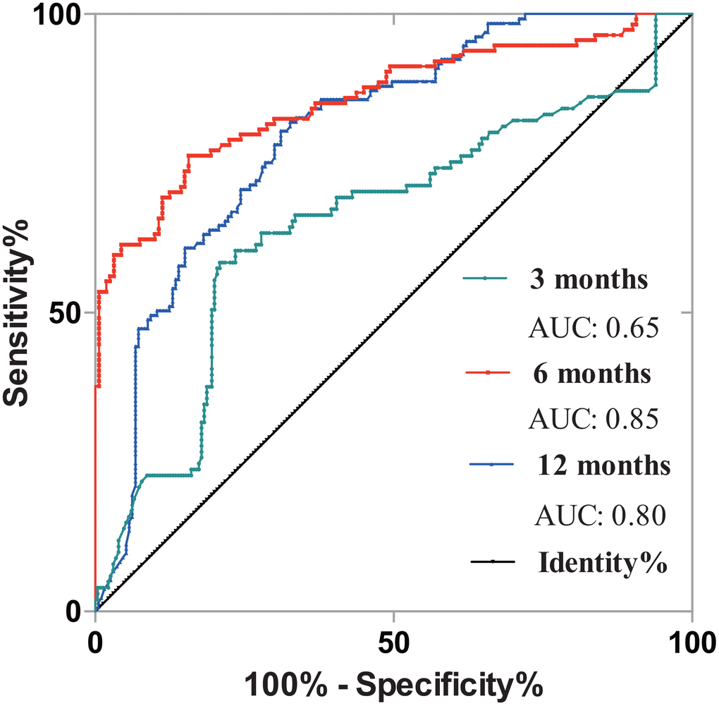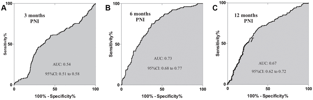We further constructed the binary logistic regression model combining the tests of SMI and PNI. Figure 6 depicted prognostic potency of different postoperative period (3-, 6- and 12-month) with ROC curves. Furthermore, when the two biomarkers were combined using the binary logistic modeling, all three AUCs were significantly better than single SMI or PNI test. AUC of 3-month, 6-month and 12-month were separately 0.65, 0.85 and 0.80 (Figure 6).