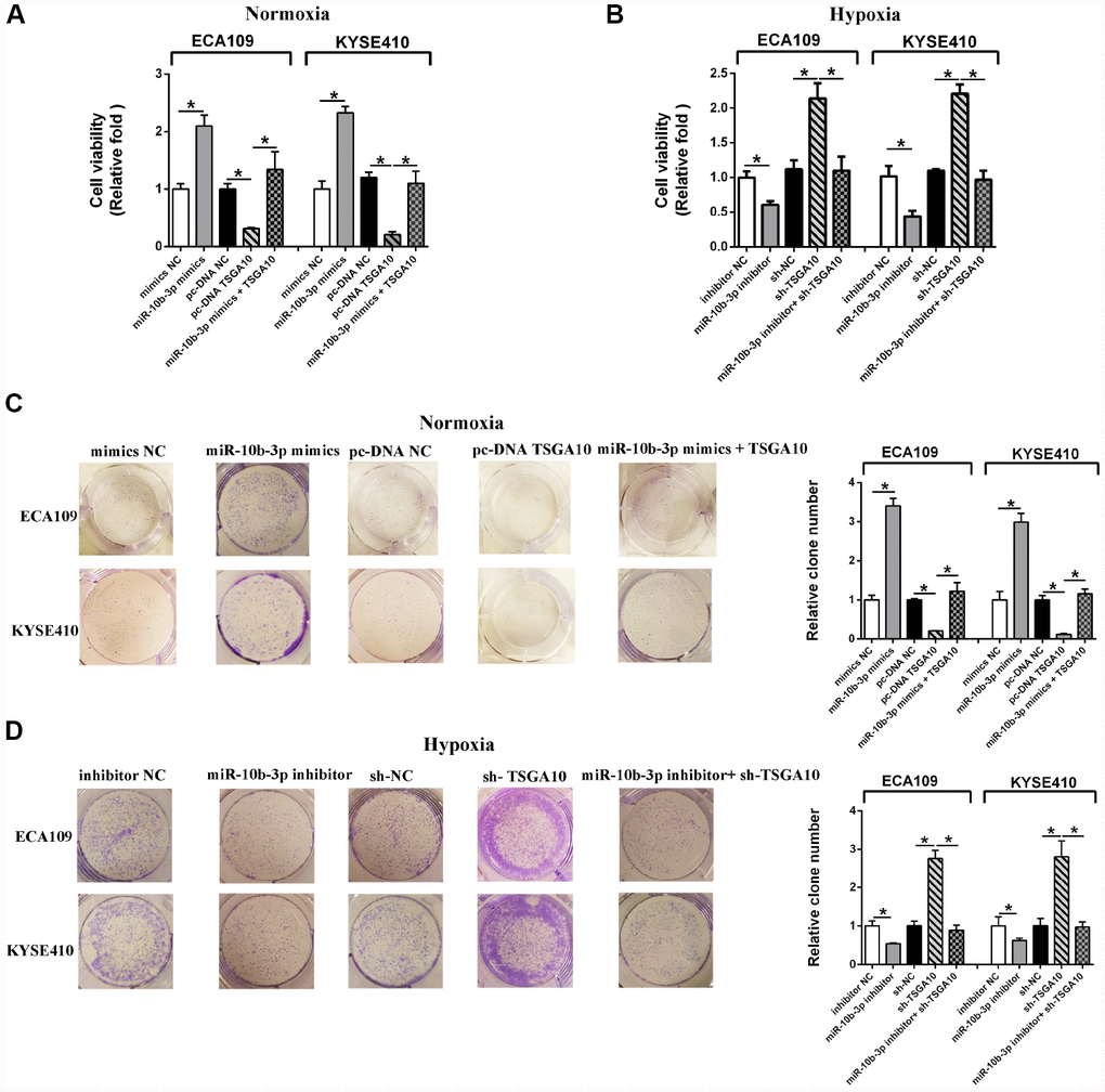 CCK8 assays revealed that under normoxic conditions, miR-10b-3p overexpression promotes ESCC cell viability (Figure 2A). Similarly, miR-10b-3p overexpression also promoted colony formation by the cells (Figure 2C). A subsequent rescue experiment confirmed that TSGA10 is the functional target of miR-10b-3p in ESCC cells. As shown in Figure 2A and 2C, the enhanced ESCC cell proliferation stimulated by miR-10b-3p was reversed by up-regulation of TSGA10.