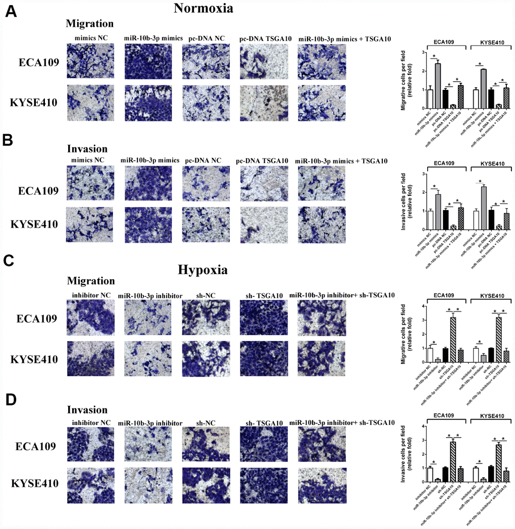 We next evaluated the influence of miR-10b-3p on ESCC cell migration and invasion. Using transwell assays, we observed that ectopic miR-10b-3p significantly enhanced the invasiveness of ESCC cells under normoxic conditions. However, up-regulation of TSGA10 diminished the effect of miR-10b-3p on ESCC cells (Figure 3A–3B). The invasiveness of ESCC cells was also enhanced by hypoxia; however, suppression of miR-10b-3p neutralized the effects of hypoxia. Rescue experiments showed that under hypoxic conditions TSGA10 knockdown restored the migration and invasion of ESCC cells that were inhibited by miR-10b-3p inhibition (Figure 3C–3D).