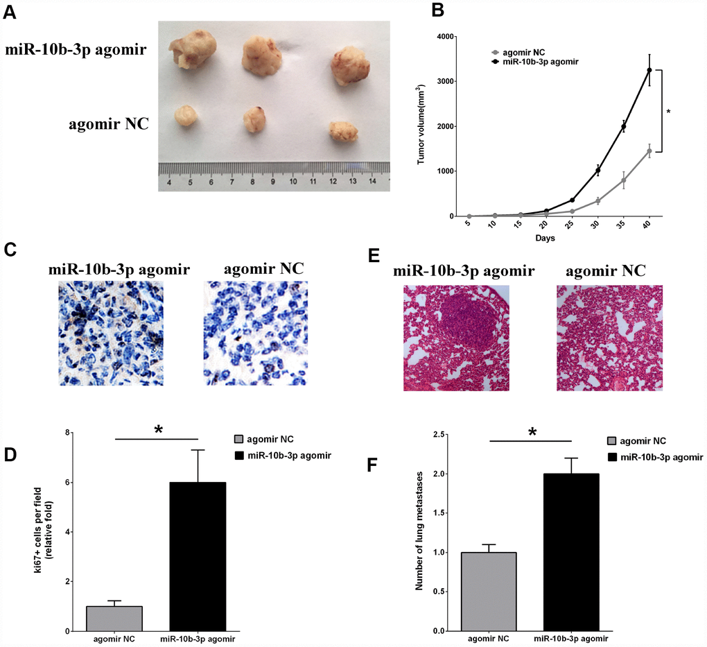 Finally, tumor cell proliferation was assessed based on immunohistochemical staining for Ki-67. The intensity of Ki-67 staining was significantly greater in tumors from the miR-10b-3p agomir group than the agomir NC group (Figure 4C and 4D). In addition, staining with hematoxylin and eosin revealed that there were more metastatic nodules present in the lungs of mice treated with miR-10b-3p agomir than agomir NC (Figure 4E and 4F).