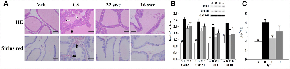 Hydroxyproline (Hyp) is the characteristic component of collagen tissue. When compared to the vehicle control, CS significantly enhanced (Figure 1C) the prostatic level of Hyp. Additionally, chronic CS exposure significantly increased (Figure 1B) the mRNA levels of Col1A1 and Col3A1, as well as obviously promoted the expression of collagen (Col)-I and Col-III when compared to the vehicle control.