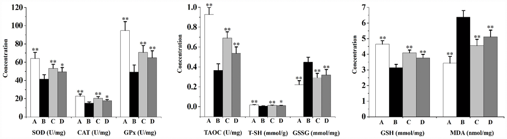 The prostatic oxidative stress was estimated by detecting the levels of the overall antioxidant status (TAOC and T-SH), the activities of antioxidant enzymes (SOD, CAT and GPx), the level of non-enzymatic antioxidant (GSH) as well as the contents of oxidative stress indicators (MDA and GSSG). The prostate local inflammation was evaluated by measuring the levels of proinflammatory cytokines (IL-1β, IL-6 and TNF-α) as well as the levels of inflammatory-related factors (COX-2, iNOS and NO). All the procedures were performed according to the manufacturer’s instructions.