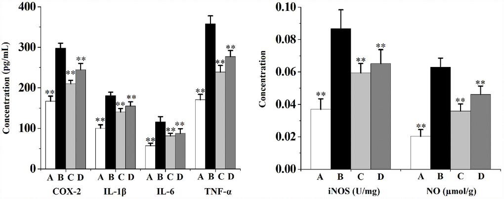 Figure 3 shows that CS exposure results in prostate local inflammation. When compared to the vehicle control, the prostatic levels of proinflammatory cytokines (interleukin (IL)-1β, IL-6 and tumor necrosis factor (TNF)-α), as well as the levels of inflammatory-related factors (cyclooxygenase (COX)-2, inducible nitric oxide synthase (iNOS) and NO) in rats from CS group were significantly increased. Swertiamarin (32 and 16 mg/kg/d) significantly decreased the levels of IL-1β, IL-6, TNF-α and NO, as well as inhibited the activities of COX-2 and iNOS compared to the CS group.