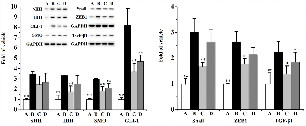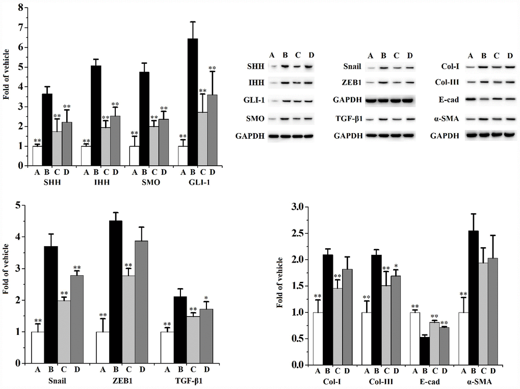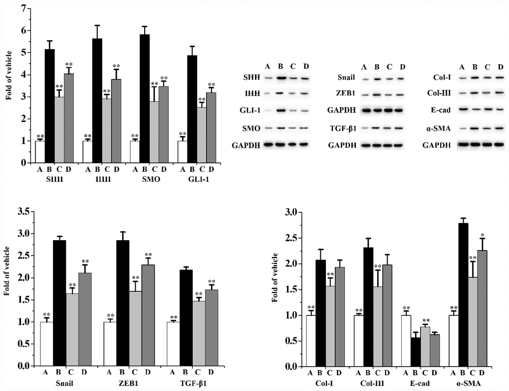 The activity of prostatic HH signaling pathway was analyzed by measuring the expression of HH signaling indicators (SHH, IHH, SMO and GLI-1), as well as its major target genes (EMT transcription factors Snail and ZEB1, promote-fibrosis cytokine TGF-β1 and extracellular matrix component Col-I) via western blot. GAPDH was used as the internal standard.